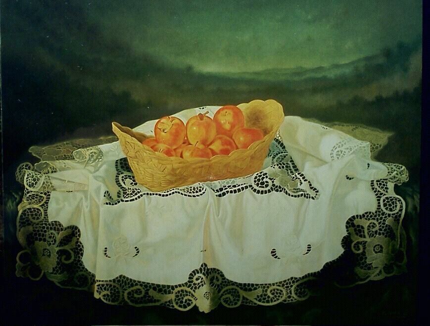 manzanas en cestillo y mantel en paisaje